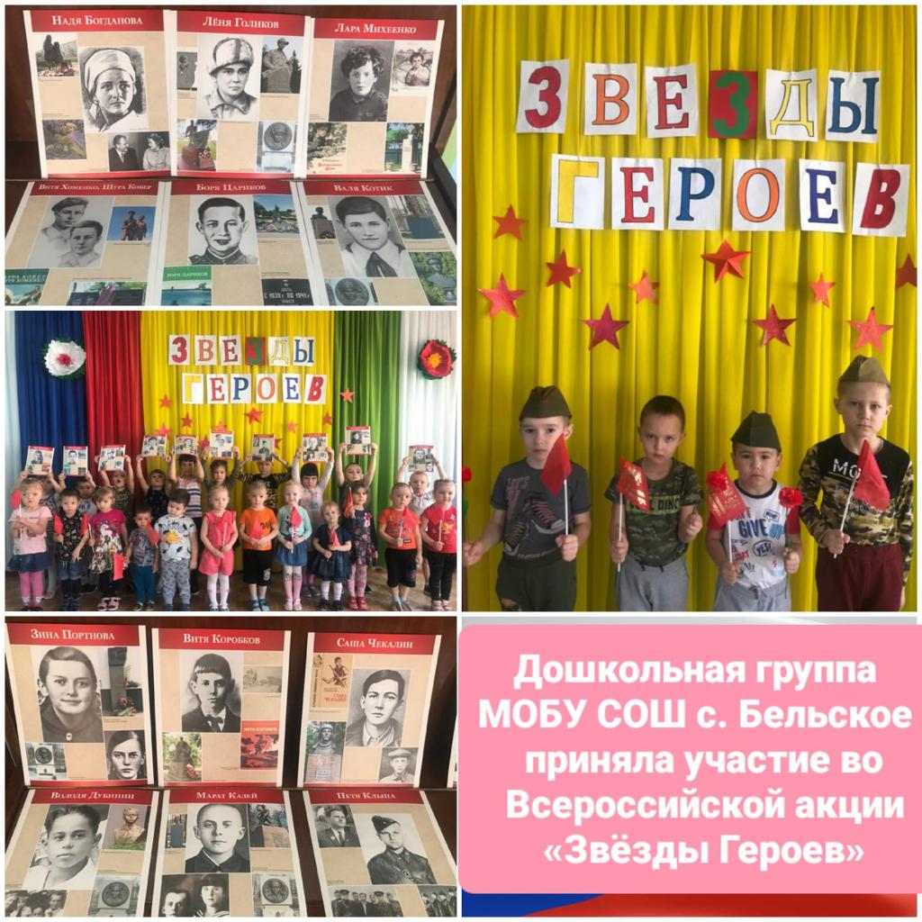 В дошкольной группе МОБУ СОШ с. Бельское прошла Всероссийская акция «Звезды Героев". Воспитанники узнали, что награда " Герой Российской Федерации " и знак особого отличия - медали "Золотая Звезда"- это наивысшая награда страны, которая присуждается "за заслуги перед государством и народом, связанные с совершением геройского подвига", также изготовили "звезды" своими руками.